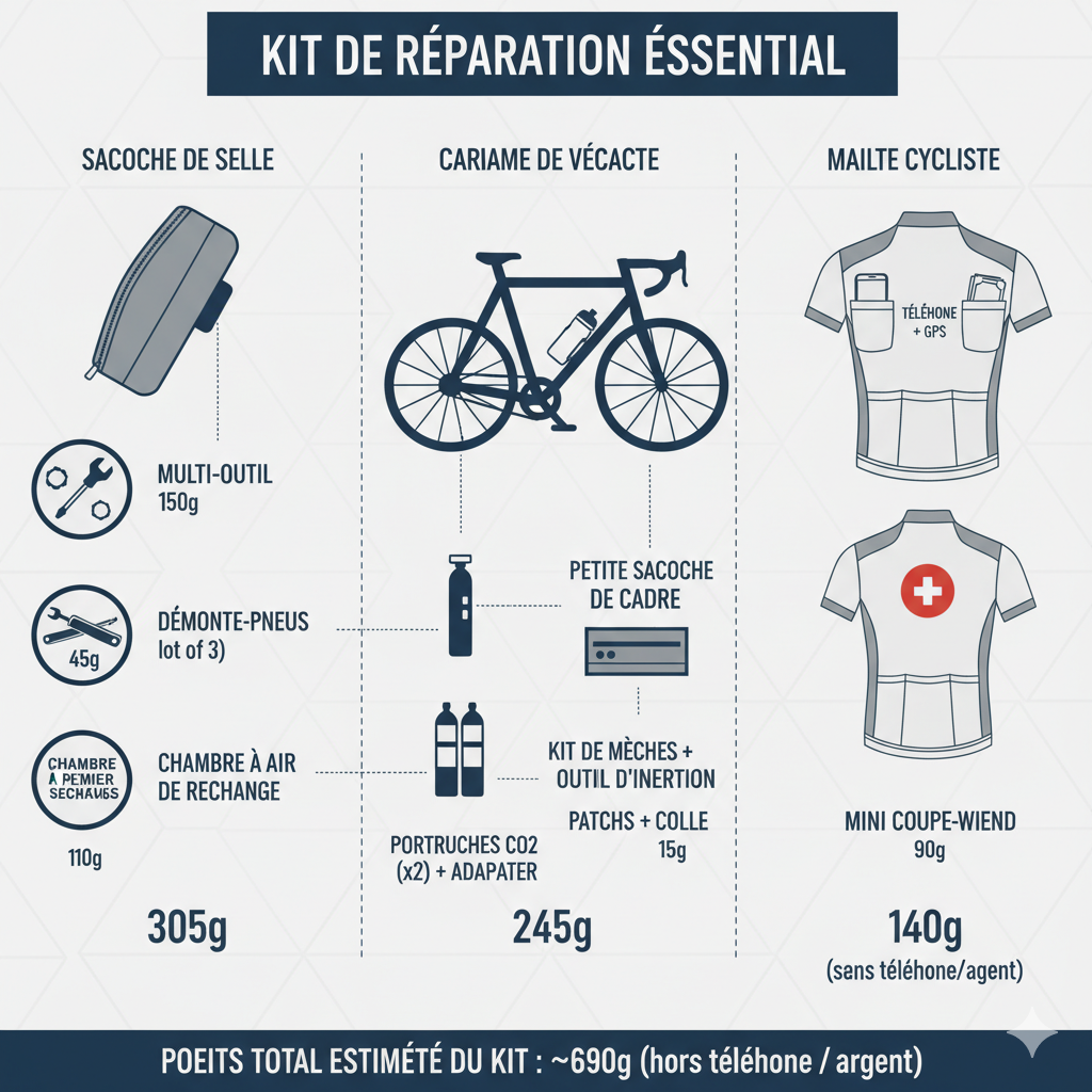 L’infographie ci-dessus montre comment répartir efficacement votre équipement de réparation. La sacoche de selle accueille les outils lourds comme le multi-outils et les démonte-pneus, tandis que la cariame de vécacte (sacoche de cadre) reçoit les chambres à air de rechange et les cartouches CO2. Le maillot cycliste, avec ses poches arrière, reste idéal pour les éléments légers et fréquemment utilisés comme le mini coupe-vent et la trousse de premiers soins. Cette organisation permet d’accéder rapidement à chaque élément sans déséquilibrer le vélo, tout en maintenant un poids total raisonnable d’environ 690 g (hors téléphone et argent).