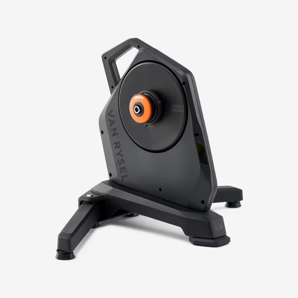 La nouvelle gamme de home trainers Van Rysel présente une architecture repensée et de nouveaux capteurs pour une précision et une connectivité accrues. Chaque modèle est désormais équipé du nouveau système Zwift Click & Cog, offrant un double contrôle pour une gestion fluide de la résistance.